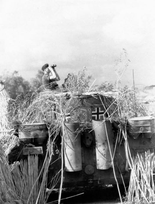 sPzAbt 503 331 Автор mazapura | 2025-10-06 0 коментарів Замаскований танк Tiger I № 331 з 3-ї роти 503-го танкового батальйону, командир якого через бінокль спостерігає за рухами ворога в Бєлгородському районі під час операції «Цитадель» під Курськом у липні 1943 року.